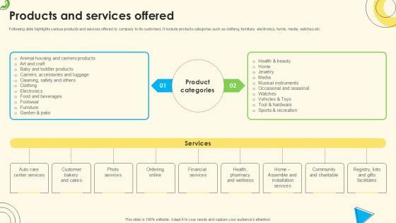 Following slide highlights various products and services offered by company to its customers. It include products categories such as clothing, furniture, electronics, home, media, watches etc. Slidegeeks has constructed Products And Services Offered Sales Pitch Deck For Online Retail Ppt Template after conducting extensive research and examination. These presentation templates are constantly being generated and modified based on user preferences and critiques from editors. Here, you will find the most attractive templates for a range of purposes while taking into account ratings and remarks from users regarding the content. This is an excellent jumping-off point to explore our content and will give new users an insight into our top-notch PowerPoint Templates. Following slide highlights various products and services offered by company to its customers. It include products categories such as clothing, furniture, electronics, home, media, watches etc.