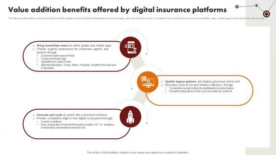 The following slide outlines various benefits provided by digital insurance systems that enable insurers to be agile, quick and customer centric. It consists of key components such as bring immediate value, update legacy systems and innovate and scale. Find a pre-designed and impeccable Technology Trends In Online Insurance Value Addition Benefits Offered By Digital Insurance Platforms. The templates can ace your presentation without additional effort. You can download these easy-to-edit presentation templates to make your presentation stand out from others. So, what are you waiting for Download the template from Slidegeeks today and give a unique touch to your presentation. The following slide outlines various benefits provided by digital insurance systems that enable insurers to be agile, quick and customer centric. It consists of key components such as bring immediate value, update legacy systems and innovate and scale.