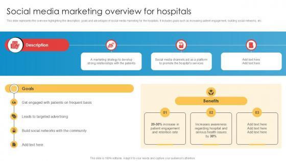 This slide represents the overview highlighting the description, goals and advantages of social media marketing for the hospitals. It includes goals such as increasing patient engagement, building social networks, etc. Are you in need of a template that can accommodate all of your creative concepts This one is crafted professionally and can be altered to fit any style. Use it with Google Slides or PowerPoint. Include striking photographs, symbols, depictions, and other visuals. Fill, move around, or remove text boxes as desired. Test out color palettes and font mixtures. Edit and save your work, or work with colleagues. Download Social Media Marketing Overview For Implementation Of Online Ppt Presentation and observe how to make your presentation outstanding. Give an impeccable presentation to your group and make your presentation unforgettable. This slide represents the overview highlighting the description, goals and advantages of social media marketing for the hospitals. It includes goals such as increasing patient engagement, building social networks, etc.