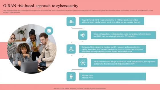 This slide depicts the risk based approach of open RAN to cybersecurity. The O RAN Alliance acknowledges cybersecurity as a critical item on its agenda and is working hard to figure out the best way to strengthen the O RAN systems cyber resilience. Get a simple yet stunning designed Open Radio Access Network IT O RAN Risk Based Approach To Cybersecurity Template PDF. It is the best one to establish the tone in your meetings. It is an excellent way to make your presentations highly effective. So, download this PPT today from Slidegeeks and see the positive impacts. Our easy to edit Open Radio Access Network IT O RAN Risk Based Approach To Cybersecurity Template PDF can be your go to option for all upcoming conferences and meetings. So, what are you waiting for Grab this template today.