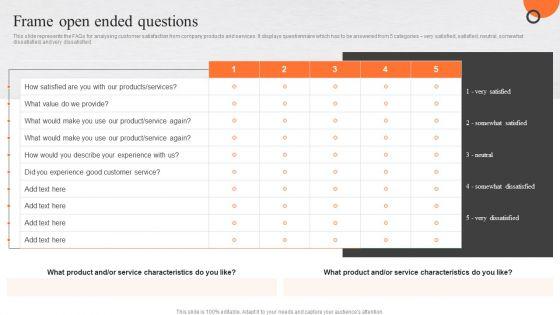 This slide represents the FAQs for analysing customer satisfaction from company products and services. It displays questionnaire which has to be answered from 5 categoriesvery satisfied, satisfied, neutral, somewhat dissatisfied, and very dissatisfied. This Client Feedback Strategies Frame Open Ended Questions Background Pdf is perfect for any presentation, be it in front of clients or colleagues. It is a versatile and stylish solution for organizing your meetings. The Client Feedback Strategies Frame Open Ended Questions Background Pdf features a modern design for your presentation meetings. The adjustable and customizable slides provide unlimited possibilities for acing up your presentation. Slidegeeks has done all the homework before launching the product for you. So, do not wait, grab the presentation templates today This slide represents the FAQs for analysing customer satisfaction from company products and services. It displays questionnaire which has to be answered from 5 categoriesvery satisfied, satisfied, neutral, somewhat dissatisfied, and very dissatisfied.