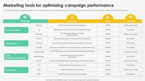 This slide highlights various marketing tools which can be used by business to improve campaign performance and business revenues. It provides information regarding software, features, price and free trials. If your project calls for a presentation, then Slidegeeks is your go-to partner because we have professionally designed, easy-to-edit templates that are perfect for any presentation. After downloading, you can easily edit B2B Marketing Techniques Marketing Tools For Optimizing Campaign Performance and make the changes accordingly. You can rearrange slides or fill them with different images. Check out all the handy templates This slide highlights various marketing tools which can be used by business to improve campaign performance and business revenues. It provides information regarding software, features, price and free trials.
