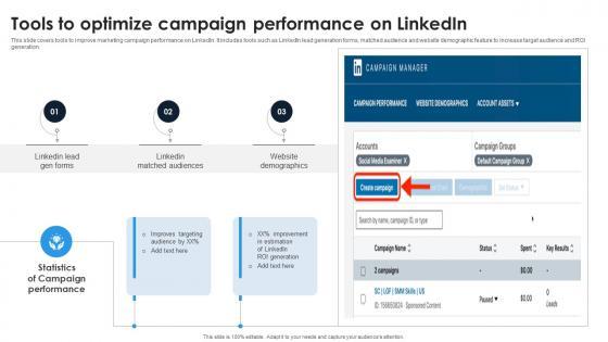 This slide covers tools to improve marketing campaign performance on LinkedIn. It includes tools such as LinkedIn lead generation forms, matched audience and website demographic feature to increase target audience and ROI generation. Are you searching for a Tools To Optimize Campaign Performance On Linkedin Portrait PDF that is uncluttered, straightforward, and original Its easy to edit, and you can change the colors to suit your personal or business branding. For a presentation that expresses how much effort you have put in, this template is ideal With all of its features, including tables, diagrams, statistics, and lists, its perfect for a business plan presentation. Make your ideas more appealing with these professional slides. Download Tools To Optimize Campaign Performance On Linkedin Portrait PDF from Slidegeeks today.