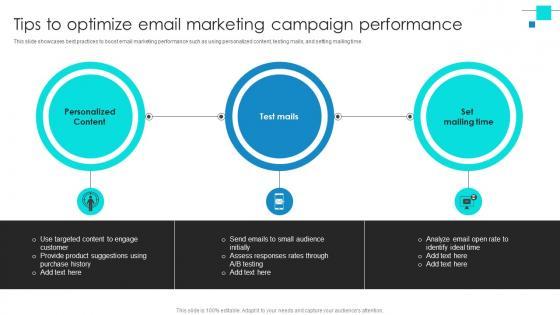 This slide showcases best practices to boost email marketing performance such as using personalized content, testing mails, and setting mailing time. From laying roadmaps to briefing everything in detail, our templates are perfect for you. You can set the stage with your presentation slides. All you have to do is download these easy-to-edit and customizable templates. Project Benchmarking Process Tips To Optimize Email Marketing Campaign Performance CRP DK SS V will help you deliver an outstanding performance that everyone would remember and praise you for. Do download this presentation today. This slide showcases best practices to boost email marketing performance such as using personalized content, testing mails, and setting mailing time.