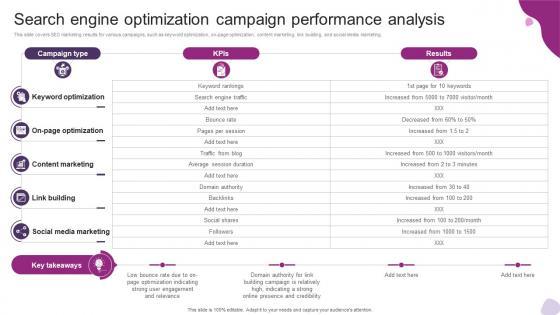 This slide covers SEO marketing results for various campaigns, such as keyword optimization, on-page optimization, content marketing, link building, and social media marketing. Coming up with a presentation necessitates that the majority of the effort goes into the content and the message you intend to convey. The visuals of a PowerPoint presentation can only be effective if it supplements and supports the story that is being told. Keeping this in mind our experts created Search Engine Optimization Campaign Performance Powerful Marketing Techniques Strategy SS V to reduce the time that goes into designing the presentation. This way, you can concentrate on the message while our designers take care of providing you with the right template for the situation. This slide covers SEO marketing results for various campaigns, such as keyword optimization, on-page optimization, content marketing, link building, and social media marketing.