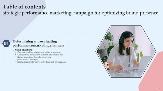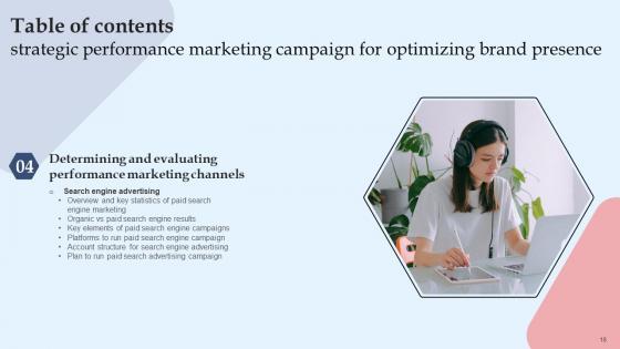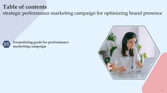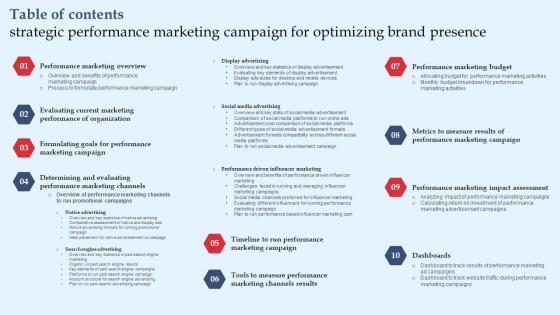 Do you have an important presentation coming up Are you looking for something that will make your presentation stand out from the rest Look no further than Table Of Contents Strategic Performance Marketing Campaign For Optimizing Brand Diagrams Pdf. With our professional designs, you can trust that your presentation will pop and make delivering it a smooth process. And with Slidegeeks, you can trust that your presentation will be unique and memorable. So why wait Grab Table Of Contents Strategic Performance Marketing Campaign For Optimizing Brand Diagrams Pdf today and make your presentation stand out from the rest. Our Table Of Contents Strategic Performance Marketing Campaign For Optimizing Brand Diagrams Pdf are topically designed to provide an attractive backdrop to any subject. Use them to look like a presentation pro.