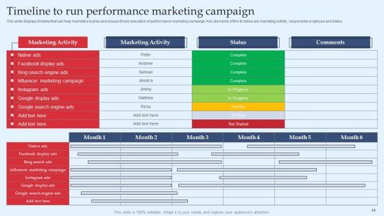 In this Strategic Performance Marketing Campaign For Optimizing Brand Presence Complete Deck, we detail the way one can plan on timelines innovation and making the best of resources. We also present to you the importance of documenting every major strategic move. In this seventy three slide presentation template, we also include umbrella concepts to make sure your authority as a handsome business person is enhanced. As always, the editable and customizable benefit is also provided making you emerge as the business Guru. Download now to establish your superiority in both running a business, and being confident enough to present about it. Our Strategic Performance Marketing Campaign For Optimizing Brand Presence Complete Deck are topically designed to provide an attractive backdrop to any subject. Use them to look like a presentation pro.