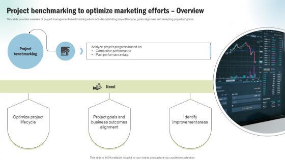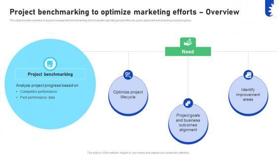 This slide provides overview of project management benchmarking which includes optimizing project lifecycle, goals alignment and analyzing project progress. Create an editable Improving Business Marketing Performance Project Benchmarking To Optimize CRP DK SS V that communicates your idea and engages your audience. Whether you are presenting a business or an educational presentation, pre-designed presentation templates help save time. Improving Business Marketing Performance Project Benchmarking To Optimize CRP DK SS V is highly customizable and very easy to edit, covering many different styles from creative to business presentations. Slidegeeks has creative team members who have crafted amazing templates. So, go and get them without any delay. This slide provides overview of project management benchmarking which includes optimizing project lifecycle, goals alignment and analyzing project progress.