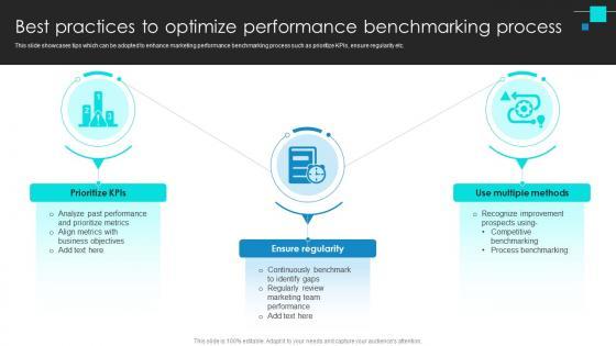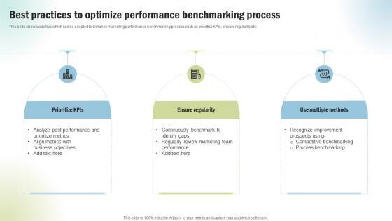 This slide showcases tips which can be adopted to enhance marketing performance benchmarking process such as prioritize KPIs, ensure regularity etc. From laying roadmaps to briefing everything in detail, our templates are perfect for you. You can set the stage with your presentation slides. All you have to do is download these easy-to-edit and customizable templates. Project Benchmarking Process Best Practices To Optimize Performance Benchmarking CRP DK SS V will help you deliver an outstanding performance that everyone would remember and praise you for. Do download this presentation today. This slide showcases tips which can be adopted to enhance marketing performance benchmarking process such as prioritize KPIs, ensure regularity etc.