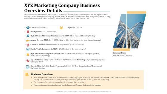 This slide shows the business details of XYZ Marketing Company such as employees, current digital channel strategy multichannel of the company, annual revenue, estimated rise in Sales after using omnichannel strategy, estimated rise in mobile traffic frequency, business offerings, CEO, Headquarters etc. Deliver an awe inspiring pitch with this creative omnichannel marketing to optimize customer purchase experience XYZ marketing company business overview details structure pdf bundle. Topics like digital channel strategy, annual revenue, customer retention rate, mobile traffic frequency, digital channel strategy that must be used in 2020 can be discussed with this completely editable template. It is available for immediate download depending on the needs and requirements of the user.