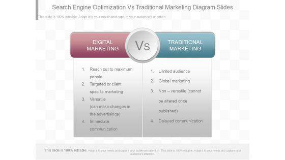 This is a search engine optimization vs traditional marketing diagram slides. This is a four stage process. The stages in this process are digital marketing, vs, traditional marketing, reach out to maximum people, targeted or client specific marketing, versatile can make changes in the advertisings, immediate communication, limited audience, global marketing, non versatile cannot be altered once published, delayed communication.