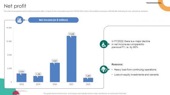 The slide showcases the net income or loss earned by eBay company for five consecutive years from 2018 to 2022, which is the profit or loss business is left with after deducting all costs, allowances, and taxes.Explore a selection of the finest Net Profit C2C Ecommerce Platform Company Profile CP SS V here. With a plethora of professionally designed and pre-made slide templates, you can quickly and easily find the right one for your upcoming presentation. You can use our Net Profit C2C Ecommerce Platform Company Profile CP SS V to effectively convey your message to a wider audience. Slidegeeks has done a lot of research before preparing these presentation templates. The content can be personalized and the slides are highly editable. Grab templates today from Slidegeeks. The slide showcases the net income or loss earned by eBay company for five consecutive years from 2018 to 2022, which is the profit or loss business is left with after deducting all costs, allowances, and taxes.