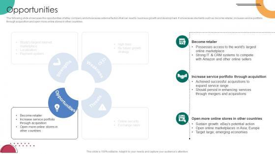 The following slide showcases the opportunities of eBay company and showcases external factors that can lead to business growth and development. It showcases elements such as become retailer, increase service portfolio through acquisition and open more online stores in other countries.Find a pre-designed and impeccable Opportunities C2C Ecommerce Platform Company Profile CP SS V. The templates can ace your presentation without additional effort. You can download these easy-to-edit presentation templates to make your presentation stand out from others. So, what are you waiting for Download the template from Slidegeeks today and give a unique touch to your presentation. The following slide showcases the opportunities of eBay company and showcases external factors that can lead to business growth and development. It showcases elements such as become retailer, increase service portfolio through acquisition and open more online stores in other countries.