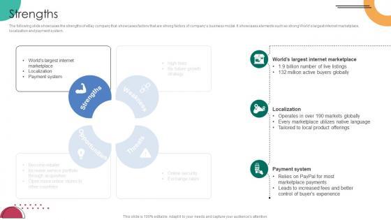 The following slide showcases the strengths of eBay company that showcases factors that are strong factors of companys business model. It showcases elements such as strong Worlds largest internet marketplace,localization and payment system.Retrieve professionally designed Strengths C2C Ecommerce Platform Company Profile CP SS V to effectively convey your message and captivate your listeners. Save time by selecting pre-made slideshows that are appropriate for various topics, from business to educational purposes. These themes come in many different styles, from creative to corporate, and all of them are easily adjustable and can be edited quickly. Access them as PowerPoint templates or as Google Slides themes. You do not have to go on a hunt for the perfect presentation because Slidegeeks got you covered from everywhere. The following slide showcases the strengths of eBay company that showcases factors that are strong factors of companys business model. It showcases elements such as strong Worlds largest internet marketplace,localization and payment system.