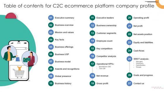 Slidegeeks has constructed Table Of Contents For C2C Ecommerce Platform Company Profile CP SS V after conducting extensive research and examination. These presentation templates are constantly being generated and modified based on user preferences and critiques from editors. Here, you will find the most attractive templates for a range of purposes while taking into account ratings and remarks from users regarding the content. This is an excellent jumping-off point to explore our content and will give new users an insight into our top-notch PowerPoint Templates. Our Table Of Contents For C2C Ecommerce Platform Company Profile CP SS V are topically designed to provide an attractive backdrop to any subject. Use them to look like a presentation pro.