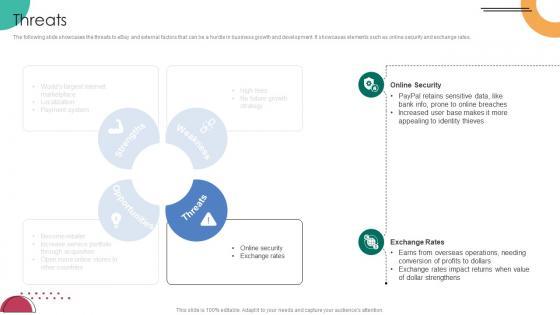 The following slide showcases the threats to eBay and external factors that can be a hurdle in business growth and development. It showcases elements such as online security and exchange rates.Here you can discover an assortment of the finest PowerPoint and Google Slides templates. With these templates, you can create presentations for a variety of purposes while simultaneously providing your audience with an eye-catching visual experience. Download Threats C2C Ecommerce Platform Company Profile CP SS V to deliver an impeccable presentation. These templates will make your job of preparing presentations much quicker, yet still, maintain a high level of quality. Slidegeeks has experienced researchers who prepare these templates and write high-quality content for you. Later on, you can personalize the content by editing the Threats C2C Ecommerce Platform Company Profile CP SS V. The following slide showcases the threats to eBay and external factors that can be a hurdle in business growth and development. It showcases elements such as online security and exchange rates.