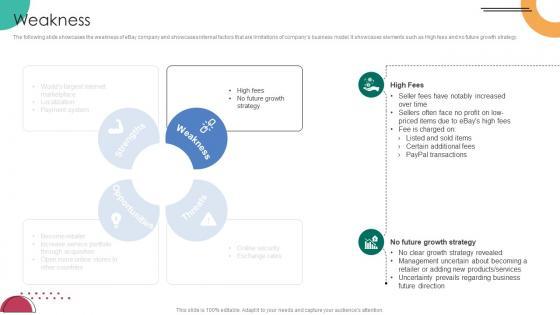 The following slide showcases the weakness of eBay company and showcases internal factors that are limitations of companys business model. It showcases elements such as High fees and no future growth strategy.This Weakness C2C Ecommerce Platform Company Profile CP SS V from Slidegeeks makes it easy to present information on your topic with precision. It provides customization options, so you can make changes to the colors, design, graphics, or any other component to create a unique layout. It is also available for immediate download, so you can begin using it right away. Slidegeeks has done good research to ensure that you have everything you need to make your presentation stand out. Make a name out there for a brilliant performance. The following slide showcases the weakness of eBay company and showcases internal factors that are limitations of companys business model. It showcases elements such as High fees and no future growth strategy.