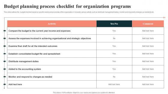 This slide outlines the budget checklist based on specific needs and processes of the organization. It includes various activity such as distribute management duties, monitor and respond to changes as needed and etc. Showcasing this set of slides titled Budget Planning Process Checklist For Organization Programs Slides Pdf. The topics addressed in these templates are Budget Planning Process, Organization Programs. All the content presented in this PPT design is completely editable. Download it and make adjustments in color, background, font etc. as per your unique business setting. This slide outlines the budget checklist based on specific needs and processes of the organization. It includes various activity such as distribute management duties, monitor and respond to changes as needed and etc.