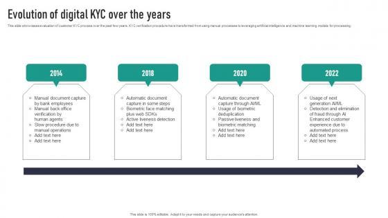 This slide showcases evaluation of customer KYC process over the past few years. KYC verification procedure have transformed from using manual processes to leveraging artificial intelligence and machine learning models for processing.Do you have an important presentation coming up Are you looking for something that will make your presentation stand out from the rest Look no further than Evolution Of Digital KYC Over The Years Artificial Intelligence Applications Mockup Pdf. With our professional designs, you can trust that your presentation will pop and make delivering it a smooth process. And with Slidegeeks, you can trust that your presentation will be unique and memorable. So why wait Grab Evolution Of Digital KYC Over The Years Artificial Intelligence Applications Mockup Pdf today and make your presentation stand out from the rest. This slide showcases evaluation of customer KYC process over the past few years. KYC verification procedure have transformed from using manual processes to leveraging artificial intelligence and machine learning models for processing.