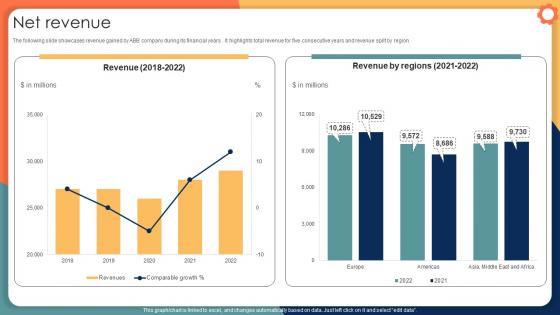 The following slide showcases revenue gained by ABB company during its financial years . It highlights total revenue for five consecutive years and revenue spilt by region. Explore a selection of the finest Net Revenue Engineering Solution Provider Company Profile CP SS V here. With a plethora of professionally designed and pre-made slide templates, you can quickly and easily find the right one for your upcoming presentation. You can use our Net Revenue Engineering Solution Provider Company Profile CP SS V to effectively convey your message to a wider audience. Slidegeeks has done a lot of research before preparing these presentation templates. The content can be personalized and the slides are highly editable. Grab templates today from Slidegeeks. The following slide showcases revenue gained by ABB company during its financial years . It highlights total revenue for five consecutive years and revenue spilt by region.