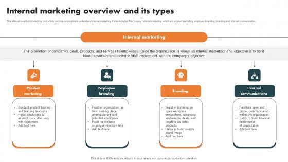 This slide shows the introductory part which can help corporates to understand internal marketing. It also includes four types of internal marketing which are product marketing, employee branding, branding and internal communication. Make sure to capture your audiences attention in your business displays with our gratis customizable Internal Marketing Overview Internal Branding Strategy For Enhanced Advocacy Download Pdf. These are great for business strategies, office conferences, capital raising or task suggestions. If you desire to acquire more customers for your tech business and ensure they stay satisfied, create your own sales presentation with these plain slides. This slide shows the introductory part which can help corporates to understand internal marketing. It also includes four types of internal marketing which are product marketing, employee branding, branding and internal communication.