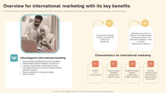 This slide represents summary for international marketing along with its characteristics and advantages. It includes product promotion, distribution strategies, global customers etc. Whether you have daily or monthly meetings, a brilliant presentation is necessary. Overview For International Marketing With Its Key Benefits Ppt File Examples PDF can be your best option for delivering a presentation. Represent everything in detail using Overview For International Marketing With Its Key Benefits Ppt File Examples PDF and make yourself stand out in meetings. The template is versatile and follows a structure that will cater to your requirements. All the templates prepared by Slidegeeks are easy to download and edit. Our research experts have taken care of the corporate themes as well. So, give it a try and see the results.