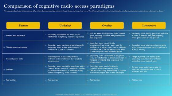 This slide describes the comparison between different cognitive radio access paradigms, such as underlay, overlay, and interweave. The difference is based on network side information, simultaneous transmission, transmit power limits, and hardware. Slidegeeks is here to make your presentations a breeze with Cognitive Radio Network IT Comparison Of Cognitive Radio Access Paradigms Graphics PDF With our easy to use and customizable templates, you can focus on delivering your ideas rather than worrying about formatting. With a variety of designs to choose from, you are sure to find one that suits your needs. And with animations and unique photos, illustrations, and fonts, you can make your presentation pop. So whether you are giving a sales pitch or presenting to the board, make sure to check out Slidegeeks first.