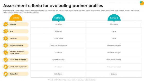 This slide presents partner profiling criteria for assessing and identify right partners that align with your business goals. It evaluates on the basis of criteria such as , industry, size, location, target audience, business methods work habits, focus and audience, goals and objectives and reputation. Want to ace your presentation in front of a live audience Our Assessment Criteria For Evaluating Partner Profiles Partner Relationship Ppt Template can help you do that by engaging all the users towards you. Slidegeeks experts have put their efforts and expertise into creating these impeccable powerpoint presentations so that you can communicate your ideas clearly. Moreover, all the templates are customizable, and easy-to-edit and downloadable. Use these for both personal and commercial use. This slide presents partner profiling criteria for assessing and identify right partners that align with your business goals. It evaluates on the basis of criteria such as , industry, size, location, target audience, business methods work habits, focus and audience, goals and objectives and reputation.