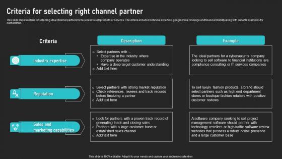 This slide shows criteria for selecting ideal channel partners for business to sell products or services. The criteria includes industry expertise, reputation, sales and marketing capabilities along with suitable examples for each criteria. If you are looking for a format to display your unique thoughts, then the professionally designed Product Marketing And Sales Expansion Through Channel Criteria For Selecting Right Channel Partner Themes PDF is the one for you. You can use it as a Google Slides template or a PowerPoint template. Incorporate impressive visuals, symbols, images, and other charts. Modify or reorganize the text boxes as you desire. Experiment with shade schemes and font pairings. Alter, share or cooperate with other people on your work. Download Product Marketing And Sales Expansion Through Channel Criteria For Selecting Right Channel Partner Themes PDF and find out how to give a successful presentation. Present a perfect display to your team and make your presentation unforgettable.