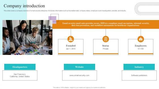 This slide covers a company overview of email security enterprise. It includes information such as foundation date, company status, employee count, headquarters, website, and industry. From laying roadmaps to briefing everything in detail, our templates are perfect for you. You can set the stage with your presentation slides. All you have to do is download these easy to edit and customizable templates. Company Introduction Paubox Capital Funding Pitch Deck Mockup Pdf will help you deliver an outstanding performance that everyone would remember and praise you for. Do download this presentation today. This slide covers a company overview of email security enterprise. It includes information such as foundation date, company status, employee count, headquarters, website, and industry.