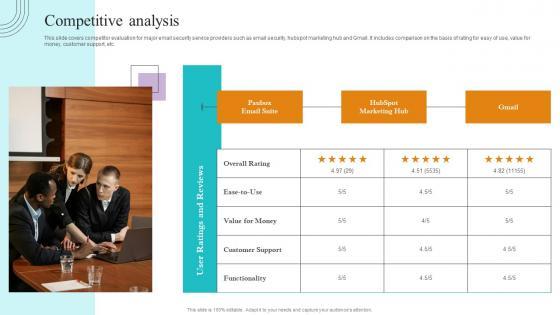 This slide covers competitor evaluation for major email security service providers such as email security, hubspot marketing hub and Gmail. It includes comparison on the basis of rating for easy of use, value for money, customer support, etc. Present like a pro with Competitive Analysis Paubox Capital Funding Pitch Deck Graphics Pdf Create beautiful presentations together with your team, using our easy to use presentation slides. Share your ideas in real time and make changes on the fly by downloading our templates. So whether you are in the office, on the go, or in a remote location, you can stay in sync with your team and present your ideas with confidence. With Slidegeeks presentation got a whole lot easier. Grab these presentations today. This slide covers competitor evaluation for major email security service providers such as email security, hubspot marketing hub and Gmail. It includes comparison on the basis of rating for easy of use, value for money, customer support, etc.