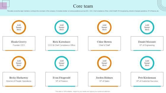 This slide covers the major members working in the core team of the company. It includes member at various positions such as CEO, COO, Chief compliance officer, chief of staff, VP of engineering, director of people operations, VP of finance, etc. Do you have an important presentation coming up Are you looking for something that will make your presentation stand out from the rest Look no further than Core Team Paubox Capital Funding Pitch Deck Inspiration Pdf. With our professional designs, you can trust that your presentation will pop and make delivering it a smooth process. And with Slidegeeks, you can trust that your presentation will be unique and memorable. So why wait Grab Core Team Paubox Capital Funding Pitch Deck Inspiration Pdf today and make your presentation stand out from the rest This slide covers the major members working in the core team of the company. It includes member at various positions such as CEO, COO, Chief compliance officer, chief of staff, VP of engineering, director of people operations, VP of finance, etc.
