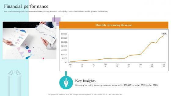 This slide covers the graphical representation monthly recurring revenue of the company. It depicts the continues revenue growth of email security. If your project calls for a presentation, then Slidegeeks is your go to partner because we have professionally designed, easy to edit templates that are perfect for any presentation. After downloading, you can easily edit Financial Performance Paubox Capital Funding Pitch Deck Introduction Pdf and make the changes accordingly. You can rearrange slides or fill them with different images. Check out all the handy templates This slide covers the graphical representation monthly recurring revenue of the company. It depicts the continues revenue growth of email security.