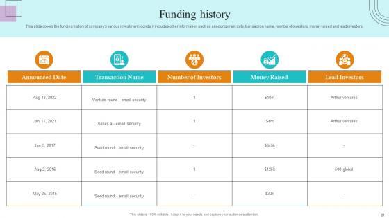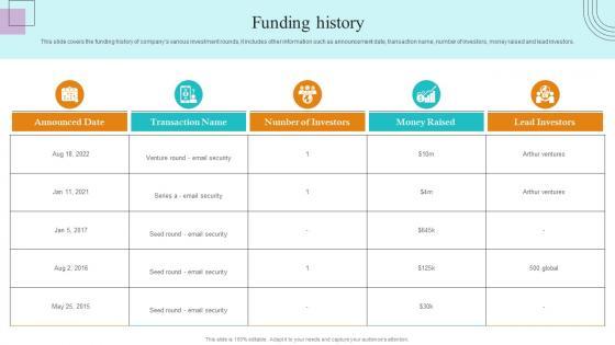 This slide covers the funding history of companys various investment rounds, it includes other information such as announcement date, transaction name, number of investors, money raised and lead investors. Are you in need of a template that can accommodate all of your creative concepts This one is crafted professionally and can be altered to fit any style. Use it with Google Slides or PowerPoint. Include striking photographs, symbols, depictions, and other visuals. Fill, move around, or remove text boxes as desired. Test out color palettes and font mixtures. Edit and save your work, or work with colleagues. Download Funding History Paubox Capital Funding Pitch Deck Brochure Pdf and observe how to make your presentation outstanding. Give an impeccable presentation to your group and make your presentation unforgettable. This slide covers the funding history of companys various investment rounds, it includes other information such as announcement date, transaction name, number of investors, money raised and lead investors.