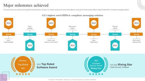 This slide covers key awards and recognitions achieved by the company. It includes awards such as top rated software, rising star of email security software, highest rated HIPAA compliant messaging solution. Coming up with a presentation necessitates that the majority of the effort goes into the content and the message you intend to convey. The visuals of a PowerPoint presentation can only be effective if it supplements and supports the story that is being told. Keeping this in mind our experts created Major Milestones Achieved Paubox Capital Funding Pitch Deck Inspiration Pdf to reduce the time that goes into designing the presentation. This way, you can concentrate on the message while our designers take care of providing you with the right template for the situation. This slide covers key awards and recognitions achieved by the company. It includes awards such as top rated software, rising star of email security software, highest rated HIPAA compliant messaging solution.