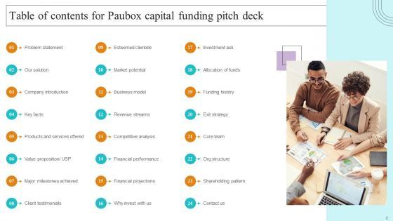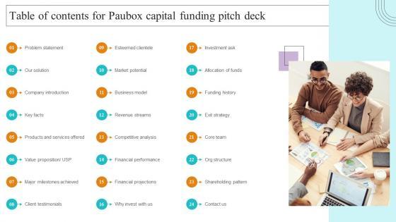 Retrieve professionally designed Table Of Contents For Paubox Capital Funding Pitch Deck Topics Pdf to effectively convey your message and captivate your listeners. Save time by selecting pre made slideshows that are appropriate for various topics, from business to educational purposes. These themes come in many different styles, from creative to corporate, and all of them are easily adjustable and can be edited quickly. Access them as PowerPoint templates or as Google Slides themes. You do not have to go on a hunt for the perfect presentation because Slidegeeks got you covered from everywhere. Our Table Of Contents For Paubox Capital Funding Pitch Deck Topics Pdf are topically designed to provide an attractive backdrop to any subject. Use them to look like a presentation pro.