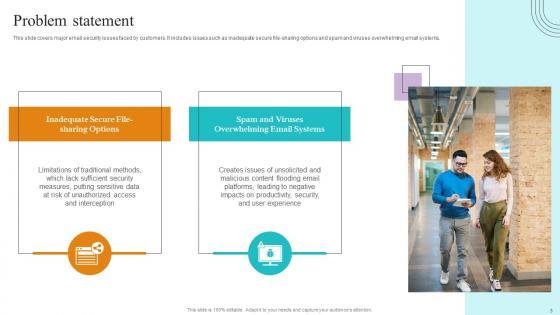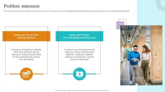 This slide covers major email security issues faced by customers. It includes issues such as inadequate secure file sharing options and spam and viruses overwhelming email systems. Explore a selection of the finest Problem Statement Paubox Capital Funding Pitch Deck Graphics Pdf here. With a plethora of professionally designed and pre made slide templates, you can quickly and easily find the right one for your upcoming presentation. You can use our Problem Statement Paubox Capital Funding Pitch Deck Graphics Pdf to effectively convey your message to a wider audience. Slidegeeks has done a lot of research before preparing these presentation templates. The content can be personalized and the slides are highly editable. Grab templates today from Slidegeeks. This slide covers major email security issues faced by customers. It includes issues such as inadequate secure file sharing options and spam and viruses overwhelming email systems.