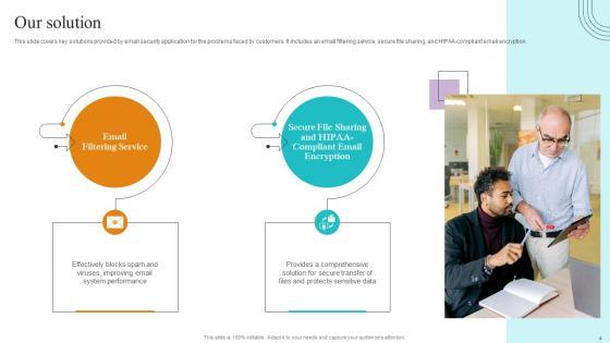 This slide covers key solutions provided by email security application for the problems faced by customers. It includes an email filtering service, secure file sharing, and HIPAA compliant email encryption. Welcome to our selection of the Our Solution Paubox Capital Funding Pitch Deck Summary Pdf. These are designed to help you showcase your creativity and bring your sphere to life. Planning and Innovation are essential for any business that is just starting out. This collection contains the designs that you need for your everyday presentations. All of our PowerPoints are 100 percent editable, so you can customize them to suit your needs. This multi purpose template can be used in various situations. Grab these presentation templates today This slide covers key solutions provided by email security application for the problems faced by customers. It includes an email filtering service, secure file sharing, and HIPAA compliant email encryption.