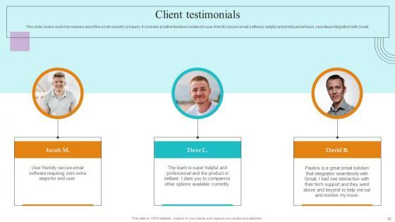 This slide covers customer reviews about the email security company. It includes positive feedback related to user friendly secure email software, helpful and professional team, seamless integration with Gmail. Get a simple yet stunning designed Client Testimonials Paubox Capital Funding Pitch Deck Professional Pdf. It is the best one to establish the tone in your meetings. It is an excellent way to make your presentations highly effective. So, download this PPT today from Slidegeeks and see the positive impacts. Our easy to edit Client Testimonials Paubox Capital Funding Pitch Deck Professional Pdf can be your go to option for all upcoming conferences and meetings. So, what are you waiting for Grab this template today. This slide covers customer reviews about the email security company. It includes positive feedback related to user friendly secure email software, helpful and professional team, seamless integration with Gmail.