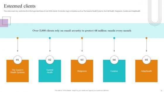This slide covers key customers from the huge client base of over 5000 clients. It includes major companies such as The Queens Health Systems, Summit Health, Walgreens, Curative and Adapthealth. Whether you have daily or monthly meetings, a brilliant presentation is necessary. Esteemed Clients Paubox Capital Funding Pitch Deck Information Pdf can be your best option for delivering a presentation. Represent everything in detail using Esteemed Clients Paubox Capital Funding Pitch Deck Information Pdf and make yourself stand out in meetings. The template is versatile and follows a structure that will cater to your requirements. All the templates prepared by Slidegeeks are easy to download and edit. Our research experts have taken care of the corporate themes as well. So, give it a try and see the results. This slide covers key customers from the huge client base of over 5000 clients. It includes major companies such as The Queens Health Systems, Summit Health, Walgreens, Curative and Adapthealth.