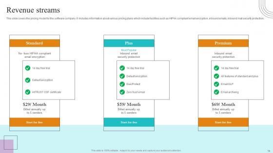 This slide covers the pricing model for the software company. It includes information about various pricing plans which include facilities such as HIPAA compliant email encryption, inbound emails, inbound mail security protection. The Revenue Streams Paubox Capital Funding Pitch Deck Structure Pdf is a compilation of the most recent design trends as a series of slides. It is suitable for any subject or industry presentation, containing attractive visuals and photo spots for businesses to clearly express their messages. This template contains a variety of slides for the user to input data, such as structures to contrast two elements, bullet points, and slides for written information. Slidegeeks is prepared to create an impression. This slide covers the pricing model for the software company. It includes information about various pricing plans which include facilities such as HIPAA compliant email encryption, inbound emails, inbound mail security protection.