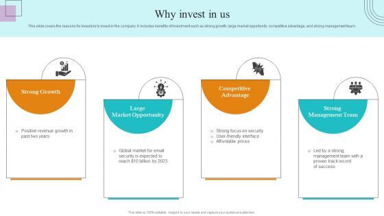 This slide covers the reasons for investors to invest in the company. It includes benefits of investment such as strong growth, large market opportunity, competitive advantage, and strong management team. Presenting this PowerPoint presentation, titled Why Invest In Us Paubox Capital Funding Pitch Deck Slides Pdf, with topics curated by our researchers after extensive research. This editable presentation is available for immediate download and provides attractive features when used. Download now and captivate your audience. Presenting this Why Invest In Us Paubox Capital Funding Pitch Deck Slides Pdf. Our researchers have carefully researched and created these slides with all aspects taken into consideration. This is a completely customizable Why Invest In Us Paubox Capital Funding Pitch Deck Slides Pdf that is available for immediate downloading. Download now and make an impact on your audience. Highlight the attractive features available with our PPTs. This slide covers the reasons for investors to invest in the company. It includes benefits of investment such as strong growth, large market opportunity, competitive advantage, and strong management team.