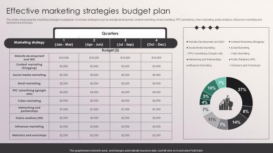This slides showcases the marketing strategies budget plan. It includes strategies such as website development, content marketing, email marketing, PPC advertising, video marketing, public relations, influencer marketing and webinars and workshops. Do you have to make sure that everyone on your team knows about any specific topic I yes, then you should give Effective Marketing Strategies Budget Plan Penetrating Markets With Financial Strategy SS V a try. Our experts have put a lot of knowledge and effort into creating this impeccable Effective Marketing Strategies Budget Plan Penetrating Markets With Financial Strategy SS V. You can use this template for your upcoming presentations, as the slides are perfect to represent even the tiniest detail. You can download these templates from the Slidegeeks website and these are easy to edit. So grab these today This slides showcases the marketing strategies budget plan. It includes strategies such as website development, content marketing, email marketing, PPC advertising, video marketing, public relations, influencer marketing and webinars and workshops.