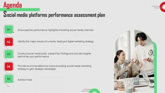 Here you can discover an assortment of the finest PowerPoint and Google Slides templates. With these templates, you can create presentations for a variety of purposes while simultaneously providing your audience with an eye-catching visual experience. Download Agenda Social Media Platforms Performance Assessment Plan Elements Pdf to deliver an impeccable presentation. These templates will make your job of preparing presentations much quicker, yet still, maintain a high level of quality. Slidegeeks has experienced researchers who prepare these templates and write high-quality content for you. Later on, you can personalize the content by editing the Agenda Social Media Platforms Performance Assessment Plan Elements Pdf. Our Agenda Social Media Platforms Performance Assessment Plan Elements Pdf are topically designed to provide an attractive backdrop to any subject. Use them to look like a presentation pro.