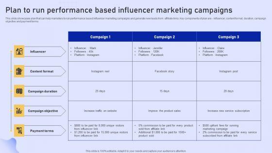 This slide showcases plan that can help marketers to run performance-based influencer marketing campaigns and generate new leads from affiliate links. Key components of plan are - influencer, content format, duration, campaign objective and payment terms This modern and well arranged Plan To Run Performance Based Influencer Marketing Campaigns Ppt PowerPoint Presentation File Pictures PDF provides lots of creative possibilities. It is very simple to customize and edit with the Powerpoint Software. Just drag and drop your pictures into the shapes. All facets of this template can be edited with Powerpoint no extra software is necessary. Add your own material, put your images in the places assigned for them, adjust the colors, and then you can show your slides to the world, with an animated slide included.