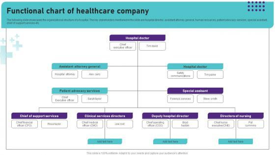 Make sure to capture your audiences attention in your business displays with our gratis customizable Functional Chart Of Healthcare Company Operational Areas Healthcare Introduction PDF. These are great for business strategies, office conferences, capital raising or task suggestions. If you desire to acquire more customers for your tech business and ensure they stay satisfied, create your own sales presentation with these plain slides. The following slide showcases the organizational structure of a hospital. The key stakeholders mentioned in the slide are hospital director, assistant attorney general, human resources, patient advocacy services, special assistant, chief of support services etc.