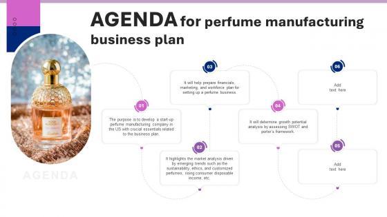 Find a pre-designed and impeccable Agenda For Perfume Manufacturing Business Plan BP SS V. The templates can ace your presentation without additional effort. You can download these easy-to-edit presentation templates to make your presentation stand out from others. So, what are you waiting for Download the template from Slidegeeks today and give a unique touch to your presentation. Our Agenda For Perfume Manufacturing Business Plan BP SS V are topically designed to provide an attractive backdrop to any subject. Use them to look like a presentation pro.