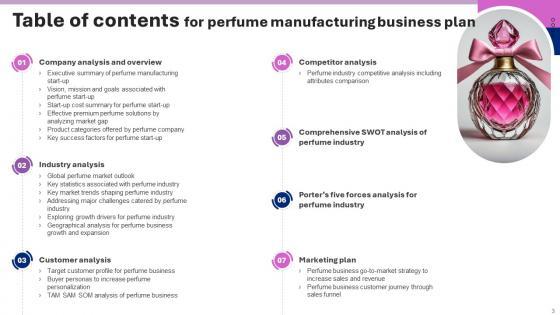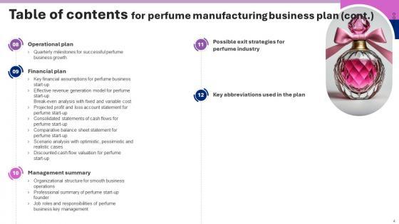 Take advantage of this well-researched and professionally-designed Perfume Manufacturing Business Plan Powerpoint Presentation Slides BP V to ace your next business meeting. Use this PPT complete deck to impress the management with your ideas for business growth and revenue increase. Use the seventy five slide Template Bundle to leave no stone unturned as you present each step of your process. Employ the visual tools within the slides such as graphs, charts, and tables to ensure that the audience can never look away from the presentation. With attractive visuals, easy to understand structure, and your knowledge, your presentation will have the attention it deserves. Download this PPT Template from the link below. Our Perfume Manufacturing Business Plan Powerpoint Presentation Slides BP V are topically designed to provide an attractive backdrop to any subject. Use them to look like a presentation pro.