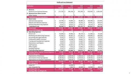 The slides provide a glimpse of the projected profit and loss statement to visualize the perfume business financial performance for the next five years. The key components are total revenue from operations, gross profit, EBITDA, etc. Slidegeeks has constructed Perfume Manufacturing Business Plan Projected Profit And Loss Account Statement For Perfume BP SS V after conducting extensive research and examination. These presentation templates are constantly being generated and modified based on user preferences and critiques from editors. Here, you will find the most attractive templates for a range of purposes while taking into account ratings and remarks from users regarding the content. This is an excellent jumping-off point to explore our content and will give new users an insight into our top-notch PowerPoint Templates. The slides provide a glimpse of the projected profit and loss statement to visualize the perfume business financial performance for the next five years. The key components are total revenue from operations, gross profit, EBITDA, etc.