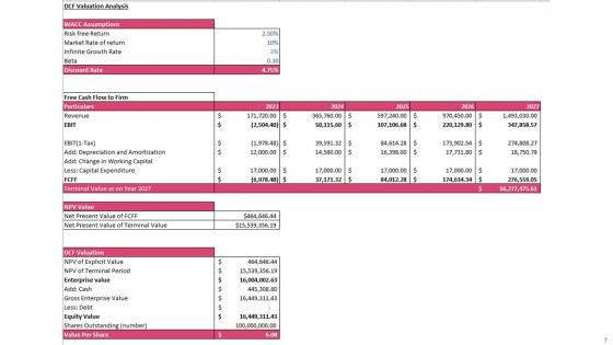 The purpose of this slide is to calculate the amount of money an investor would get from an investment after adjusting for the time value of money. It covers risk-free return, free cash flow to the company, NPV value of FCFF and terminal year, and so on. From laying roadmaps to briefing everything in detail, our templates are perfect for you. You can set the stage with your presentation slides. All you have to do is download these easy-to-edit and customizable templates. Perfume Manufacturing Business Plan Discounted Cash Flow Valuation For Perfume Start Up BP SS V will help you deliver an outstanding performance that everyone would remember and praise you for. Do download this presentation today. The purpose of this slide is to calculate the amount of money an investor would get from an investment after adjusting for the time value of money. It covers risk-free return, free cash flow to the company, NPV value of FCFF and terminal year, and so on.